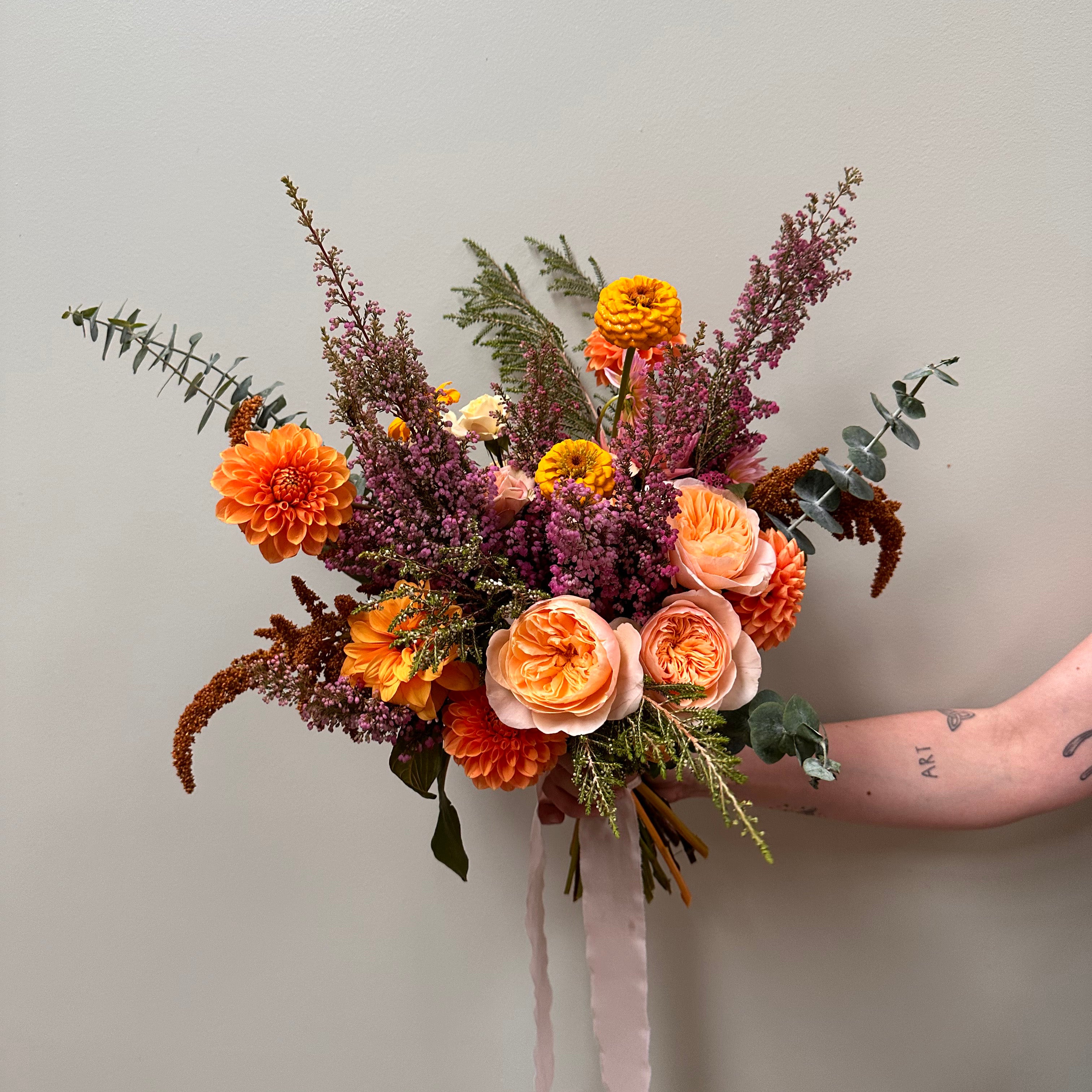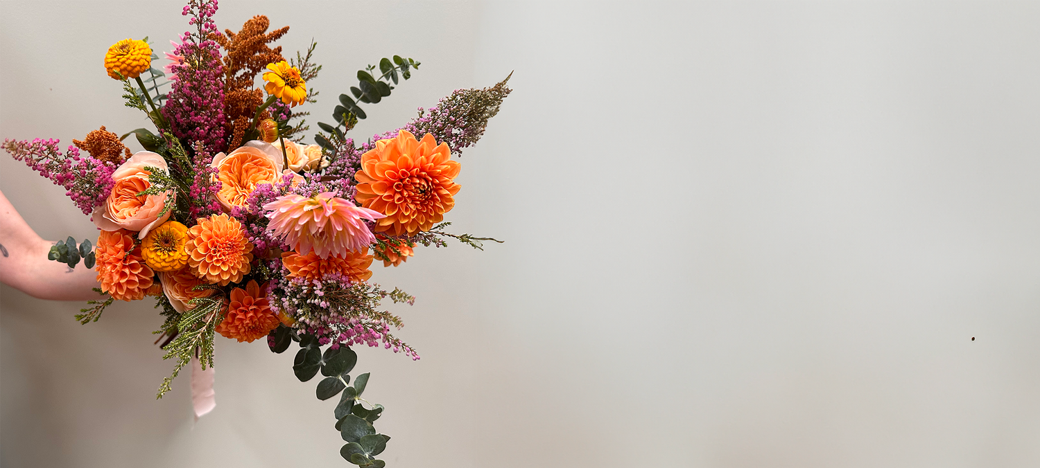 We will create gorgeous blooms for your wedding using the best seasonal flowers available on the day. To keep costs low, we don’t offer a formal consultation service or take requests on specific blooms. We talk with you about your wedding day floral requirements, colours, and style, to provide a beautiful wild flower wedding .